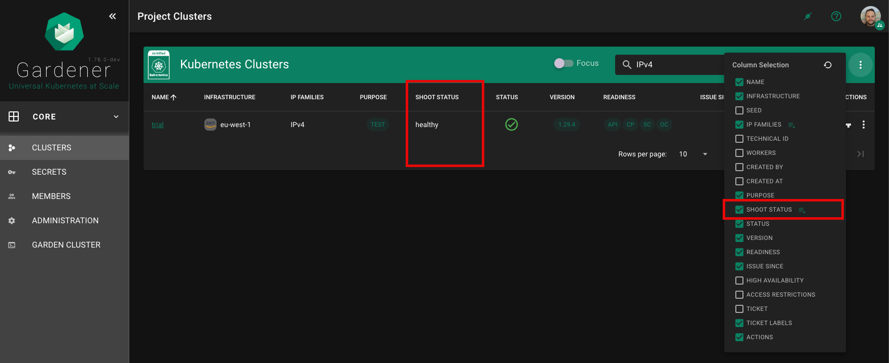 Custom fields can be shown on the cluster list, if showColumn is enabled. See configuration below for more details. In this example, a custom field for the Shoot status was configured.