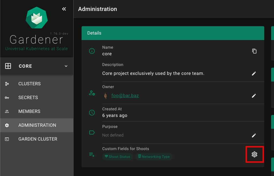 Custom shoot fields can be defined per project by specifying metadata.annotations["dashboard.gardener.cloud/shootCustomFields"]. The following is an example project yaml: