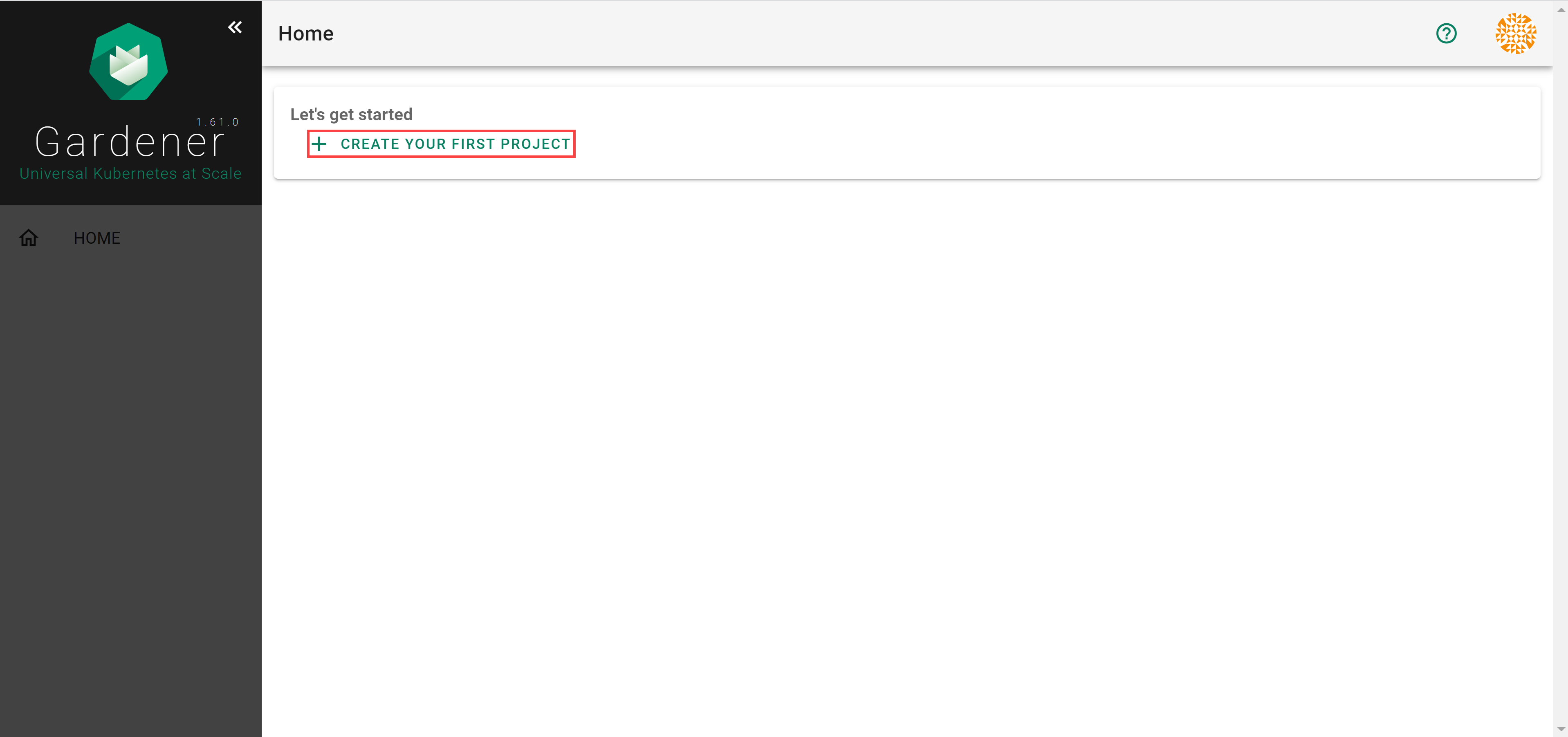 Logon to the Gardener Dashboard and choose CREATE YOUR FIRST PROJECT.
